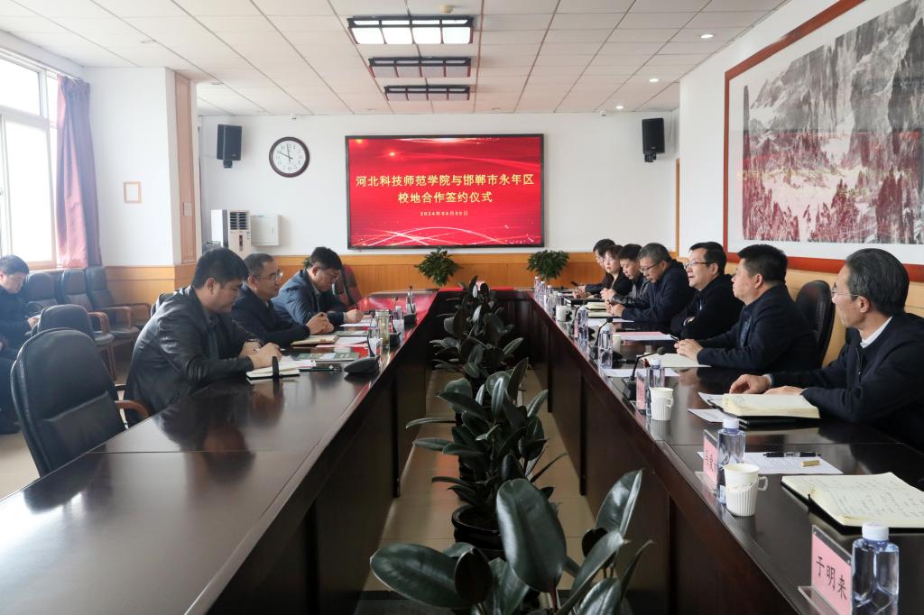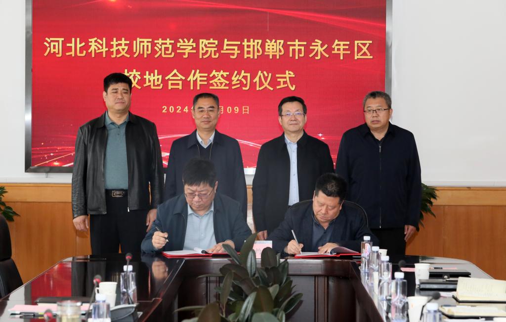 2024年4月9日,我校与邯郸市永年区校地合作签约仪式在秦皇岛校区举行。学校党委书记朱勇,党委常委、副校长冯瑞银,党委常委、副校长蒋爱林,邯郸市永年区委书记马洪广、永年区政府副区长陈冰出席签约仪式。学校党委办公室、校长办公室、乡村振兴研究中心、教务处、科研处、招生就业处、教师交流与培训中心、研究生部、继续教育学院,邯郸市永年区委办、政府办、农业农村局等主要负责同志参加活动。