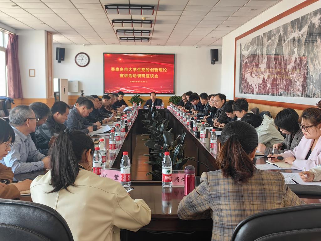 2024年4月18日,秦皇岛市大学生党的创新理论志愿宣讲活动调研座谈会在我校秦皇岛校区举办。秦皇岛市委宣传部二级调研员张悦、校党委常委、副校长冯瑞银出席会议。驻秦高校、市属各高校党委宣传部、马克思主义学院相关负责同志,我校学生处、校团委和大学生理论宣讲团学生代表,相关市直单位代表共同参加座谈会。秦皇岛市委宣传部理论科科长、四级调研员张洪涛主持会议。