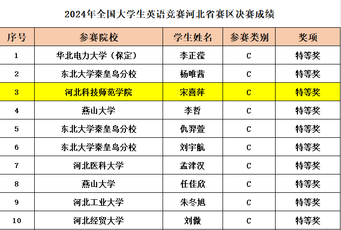 2024年5月19日,全国大学生英语竞赛河北赛区决赛在河北师范大学举行。有来自全省各大高校的200多名顶尖选手同台竞争。我校5名C类(非专业本科组)选手在与同组207名选手的激烈角逐中表现出色,其中,宋喜萍斩获全国特等奖,闫聪颖、梁楠悦、成玥霖、孙博阳4位选手斩获全国一等奖。