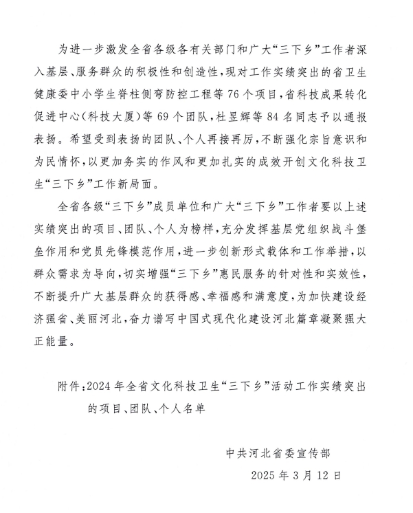 近日,中共河北省委宣传部公布《关于2024年全省文化科技卫生“三下乡”活动工作实绩突出项目、团队和个人的通报》,我校乡村振兴研究中心主任常学东教授获评全省文化科技卫生“三下乡”活动工作实绩突出个人。(编辑:孙艳敏 审核:王荣加)