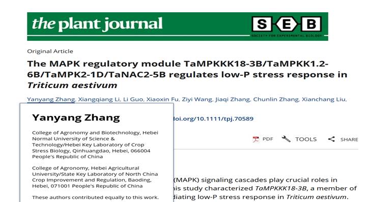 近日,我校农学与生物科技学院张艳阳在“The Plant Journal”(中科院一区TOP,IF=5.7)发表了题为“The MAPK regulatory module TaMPKKK18-3B/TaMPKK1.2-6B/TaMPK2-1D/TaNAC2-5B regulates low-P stress response in T. aestivum”研究论文。农学与生物科技学院为论文第一通讯单位,该成果得到了国家重点研发项目(2022YFD1200204)、华北作物改良与调控国家重点实验室(NCCIR2022ZZ-7)和金沙67783检测路线博士启动基金项目(2025YB018)的共同资助。