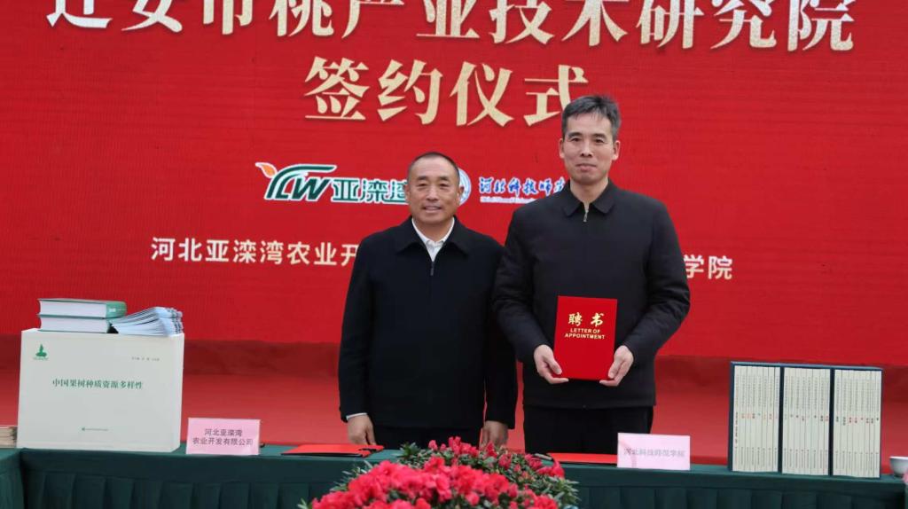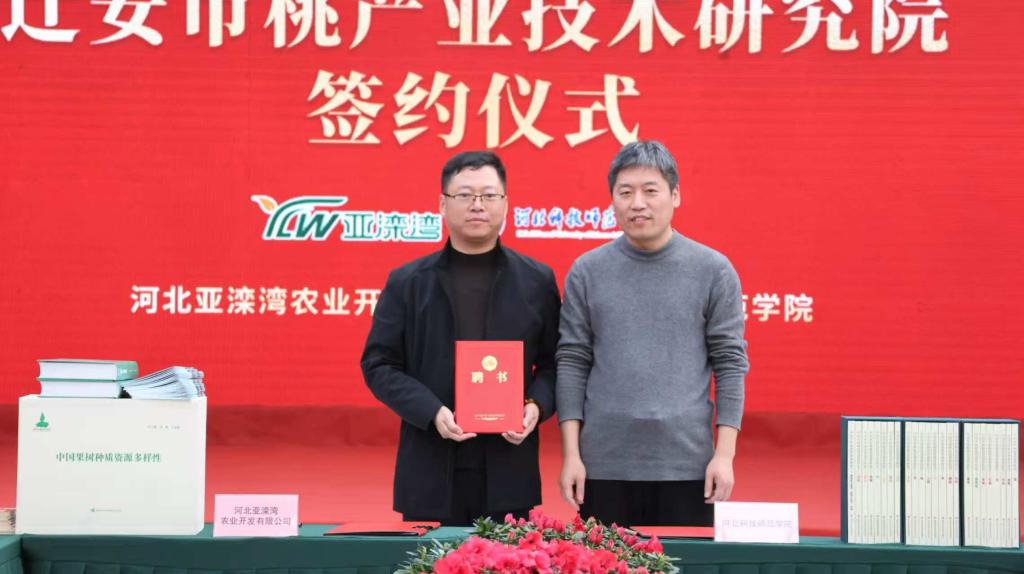 签约仪式上,杨越冬代表学校与企业签约,张明莉与陈国有共同为迁安市桃产业技术研究院揭牌,我校向合作基地赠送了学术成果和服务菜单,校桃创新团队武军凯分享了团队服务亚滦湾的工作成果,陈国有为研究院首任院长武军凯颁发聘书,我校园艺科技学院聘用张程辉为校外导师。