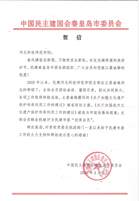 03.132026民建秦皇岛市委致信祝贺我校民建支部工作取得新成效