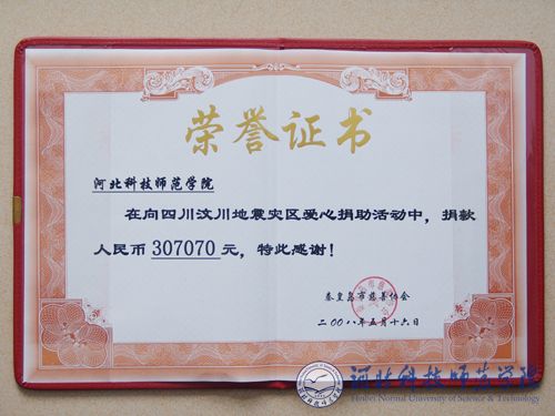 图为我校为地震灾区捐款荣誉证书