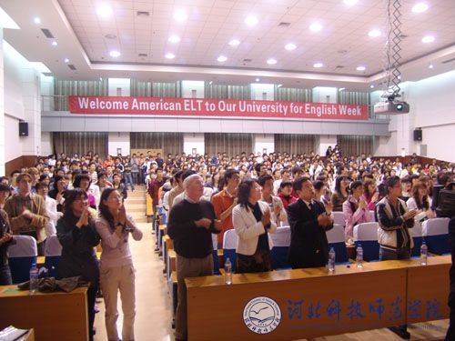 5月3日晚8:00,“中美友谊之桥—2008英语活动周”主题活动在我校秦皇岛校区逸夫楼学术报告厅举行。我校外语系和其他各系师生代表均提前赶到现场参加了活动。学术报告厅座无虚席,会场后上方打出“Welcome American ELT to Our University for English Week”醒目横幅英文标语。活动在ELT组织成员代表共同演唱的《 With a little help from my friends》的甜美英文歌曲声中拉开了帷幕,来自于2002年美国犹他州冬奥会的主唱演员Korynn的欢快、激昂的英文歌曲《Thousand miles》,《 Love is the answer》使现场气氛掀起了一波又一波新的高潮,博得现场观众阵阵热烈的掌声。美国ELT组织的创办者、负责人Joseph Bruno Dutra 介绍了ELT组织的整体概况以及已驻我校的6位外语教师的情况,其中,我校ELT组织教师团成员SHANA老师在2007年曾荣获河北省人民政府设立的外国专家省级最高荣誉奖项 “燕赵友谊奖”。该奖项是为表彰在我省经济建设和社会发展中做出突出贡献的外国专家而设立的。我省自2003年设立“燕赵友谊奖”以来,迄今已评选五届,SHANA是我校第一位获此奖项的外国专家。学术报告厅现场充满了友好、欢快、和谐、热烈的浓厚氛围。