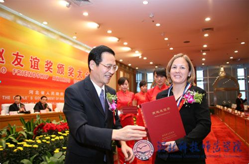 图为在我省2007年“燕赵友谊奖”颁奖典礼上,中共河北省委常委、常务副省长付志方为SHANA颁奖