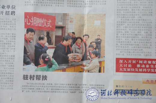 2013年4月27日,中青在线网、《秦皇岛日报》、蔚县电视台等新闻媒体分别报道了我校驻邢家庄村工作组开展的为帮扶村小学师生捐赠校服活动。此前,《张家口市深化加强基层建设年活动简报》、蔚县电视台、蔚县网也先后报道了我校驻邢家庄村工作组开展的帮扶工作。