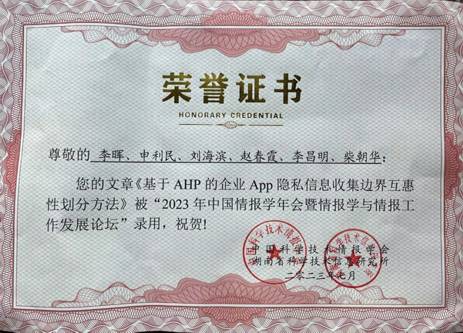 2023年7月12日至14日,我校工商管理学院信息教学部李晖老师参加了2023年中国情报学年会。撰写的论文“基于AHP的企业App隐私信息收集边界互惠性划分方法”被大会录用,并到会参与交流,成果得到了业内专家们的一致认可。通过此次参会,展示了我校在情报学方面的学术成果,促进了我校在情报学方向的发展,加强了我校与其它高校的交流,推进了信息管理与信息系统专业朝着大数据分析、信息行为研究、数据安全等新时代关注热点方向的不断探索和创新。