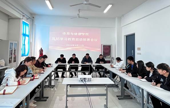 2024年4月15日,体育与健康学院召开党纪学习教育启动部署会,深入学习贯彻党中央关于在全党开展党纪学习教育的有关要求,研究部署学院党纪学习教育工作。号召党员干部进一步提高政治站位,充分认识开展党纪学习教育的重要性,切实提高政治站位,为高标准、高质量组织开展好党纪学习教育奠定坚实基础。随后,体育与健康学院各党支部第一时间落实学习任务,党支部书记切实担负起责任,通过召开党员大会,传达习近平总书记关于开展党纪学习教育的重要讲话和重要指示精神、学校以及学院党纪学习教育启动部署会的有关要求,并结合工作实际制定学习计划,力求在“学”上下功夫,在“做”上求实效。