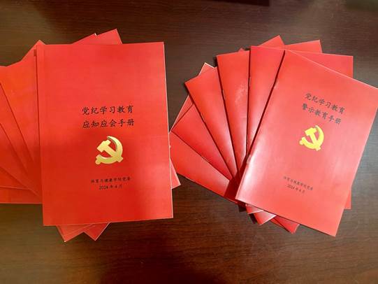 为让广大党员干部把握好党纪学习教育重点,体育与健康学院党委编发印制《党纪学习教育应知应会手册》和《党纪学习教育警示教育手册》,《手册》以电子版和纸质版的形式全覆盖配发学院全体党员,让广大党员干部有了随身方便携带的“充电宝”,确保全体党员按照“规定动作路线图”做到位。体育与健康学院官网还开设了“党纪学习教育”专栏,常态化推送《中国共产党纪律处分条例》(以下简称《条例》)等解读图文,大力宣传党中央关于党纪学习教育的决策部署,深入宣传学院党纪学习教育的做法成效,增强党员、干部对党纪学习教育的知晓度和关注度,多措并举营造党纪学习教育浓厚氛围,让广大党员、干部时刻保持“在线”状态。