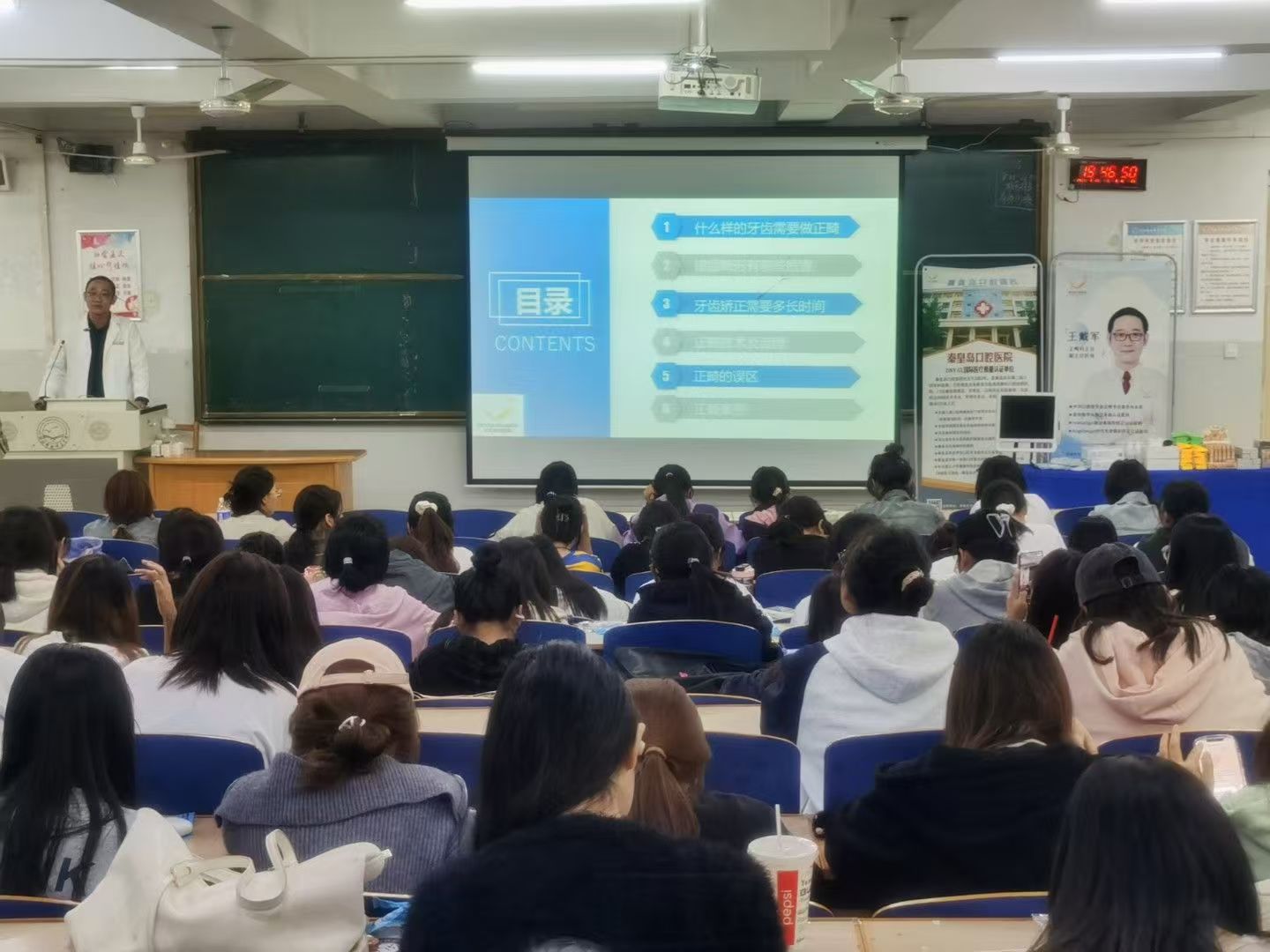 讲座过程中,各位专业医生讲述了牙齿问题的分类、深覆合、牙齿拥挤和牙龈出血等知识,同时利用PPT和现实中的事例加深同学们对概念的理解,在场的同学们认真听讲,积极提问。工作人员根据同学们提出的牙齿矫正治疗和正畸托槽选择等问题进行解答。