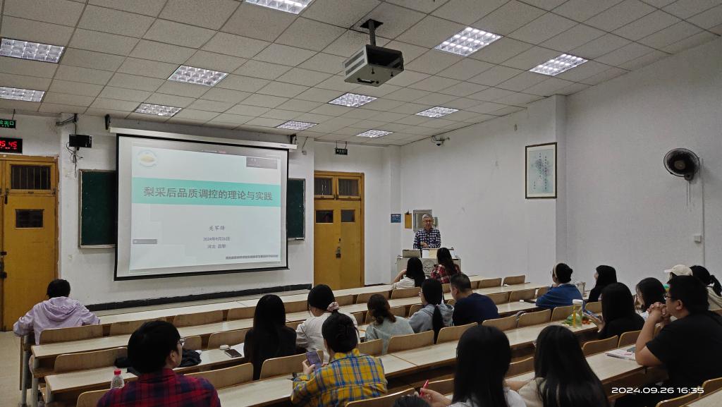 2024年9月26日,为提升学生的科研素养,激发学生的创新思维,食品科技学院邀请关军锋研究员作题为“梨采后品质变化与调控技术”的学术讲座。食品科技学院部分老师和全体研究生听取讲座。
