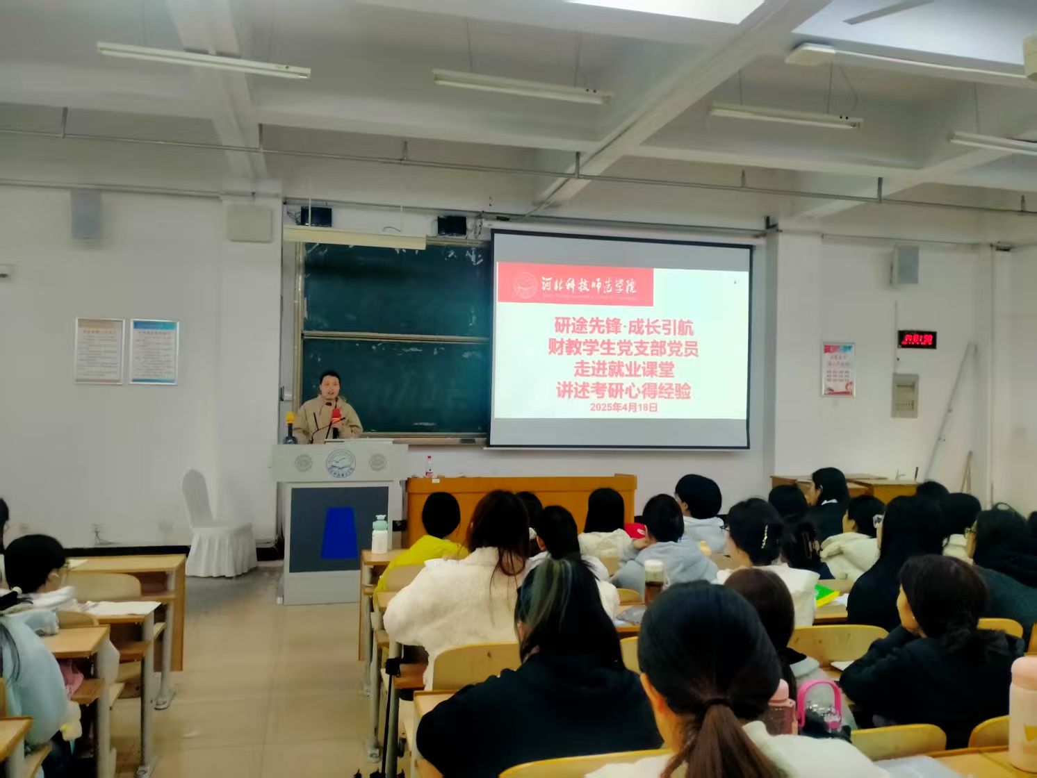 2025年4月18日,财教学生党支部的党员们走进就业课堂开展“研途先锋·成长引航”考研经验分享会。财教学生党支部骨干党员根据自己考研上岸经验,为财务会计教育专业三年级学生就考研相关话题展开深入交流,为同学们提供宝贵经验与实用建议,助力考研之路。