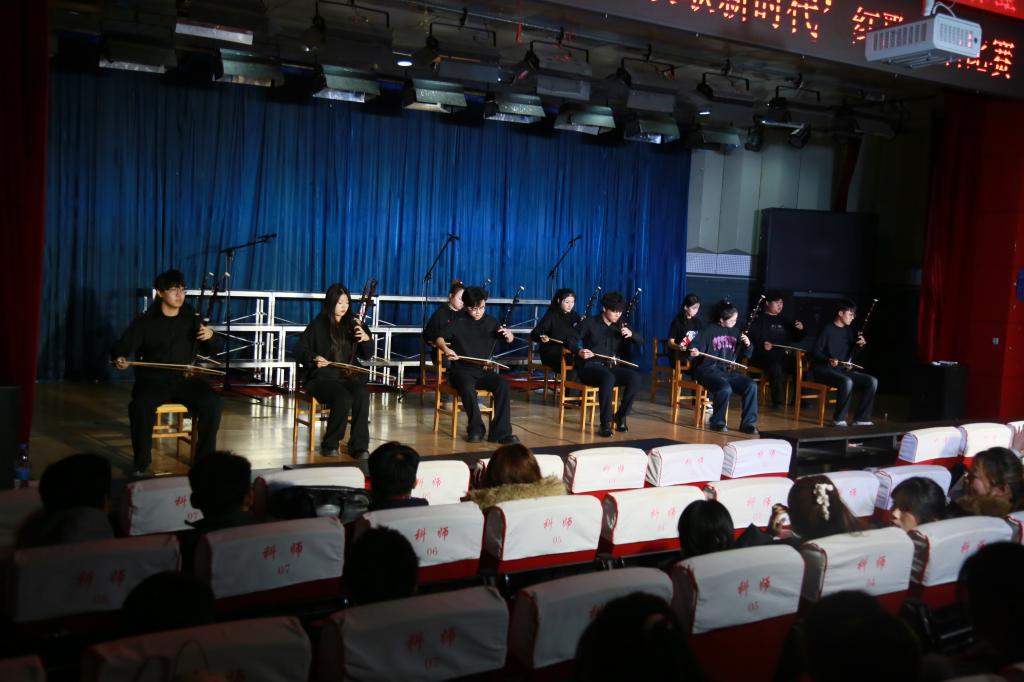 为让比赛节奏更显张弛有度,在班级合唱队伍交替的间隙,几场精心编排的串场节目轮番登场,古筝重奏《如愿》、《保卫黄河》,不同声部的古筝音色交织缠绕,琴弦交错间,将中华儿女保卫家国的壮志豪情、人民对家国安宁的美好祝愿演绎得淋漓尽致;二胡齐奏《赛马》惊艳亮相,急促的弓法、铿锵的节奏,仿佛将万马奔腾的草原画卷铺展在眼前,热烈奔放的旋律瞬间点燃全场;声乐专业同学带来的歌曲《有我》,通过饱含深情的演绎,将“承风骨亦有锋芒,有梦则刚”的青春誓言传递到每一位观众心中,歌声落罢,全场掌声经久不息,为紧张的比赛增添了更多青春风采。