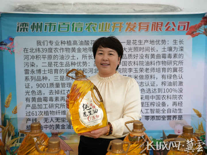 “我们的原料是高油酸花生,人体必需的营养素——不饱和脂肪酸含量高……”来到滦州市百信农业开发有限公司的展位,一桶桶金黄透亮的纯冷榨花生油引人注目,公司总经理郭秀云正向现场观摩人员详细介绍着公司产品。
